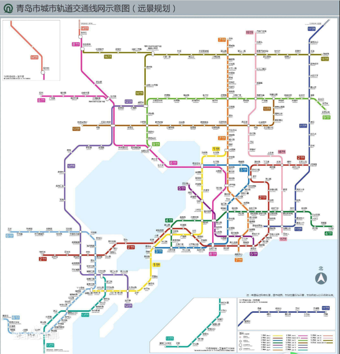 此外,根據青島市地鐵工程建設指揮部辦公室組織編制完成的《青島市城市軌道交通線網規劃調整(2015年)》,強調軌道交通線網對“全域統籌,三城聯動,軸帶展開,生態間隔,組團發展”戰略的支持,青島市軌道交通遠景年線網共規劃16條線路,總規模約807km。