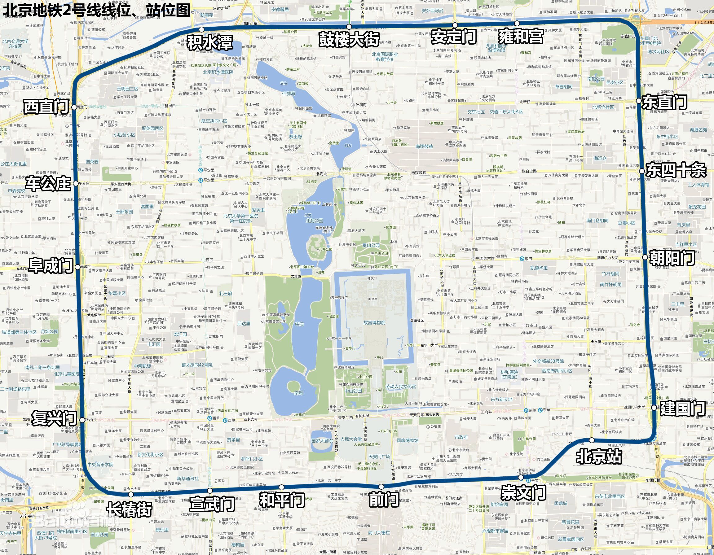 據2020年3月北京地鐵官網顯示,北京地鐵2號線成環貫通運營,走向與原北京城池內城墻基本重合,途經北京西直門、阜成門、復興門、宣武門、和平門、前門、崇文門、建國門、朝陽門、東直門、安定門,最后回到西直門 。