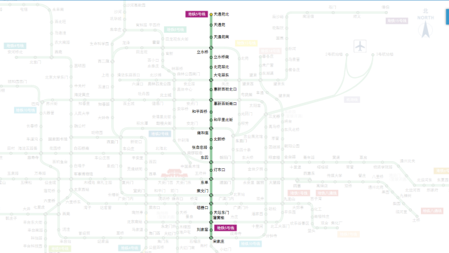 據2020年10月北京地鐵官網顯示,北京地鐵5號線呈南北走向,線路位于城市中軸線東側,南北向連接豐臺、東城、朝陽、昌平4個區 [3] 。