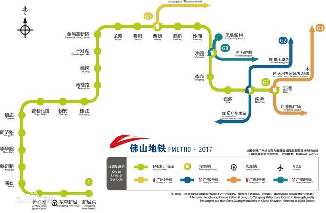 據2017年8月佛山地鐵官網信息顯示,佛山地鐵共運營地鐵線路1條,即廣佛線(佛山地鐵1號線),并運營有軌電車1條,即高明區現代有軌電車示范線 [3] 。廣佛線西起佛山市新城東站,東達廣州市瀝滘站,全長38.5千米,全線共設車站25座。其中,佛山市境內21.47千米,車站15座;廣州市境內17.4千米,車站10座。 [4]