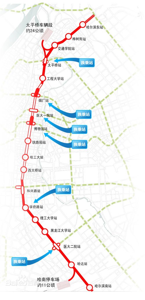 哈爾濱地鐵1號線東起道外區化工路,經哈爾濱東站、太平橋、東大直街、西大直街、學府路、哈爾濱南站至平房區新疆大街站,采用6節編組B2型列車;線路全長27.3公里,設25座車站(哈爾濱東站至哈爾濱南站段為1號線一、二期工程),該段全長17.73公里,共設18座車站。