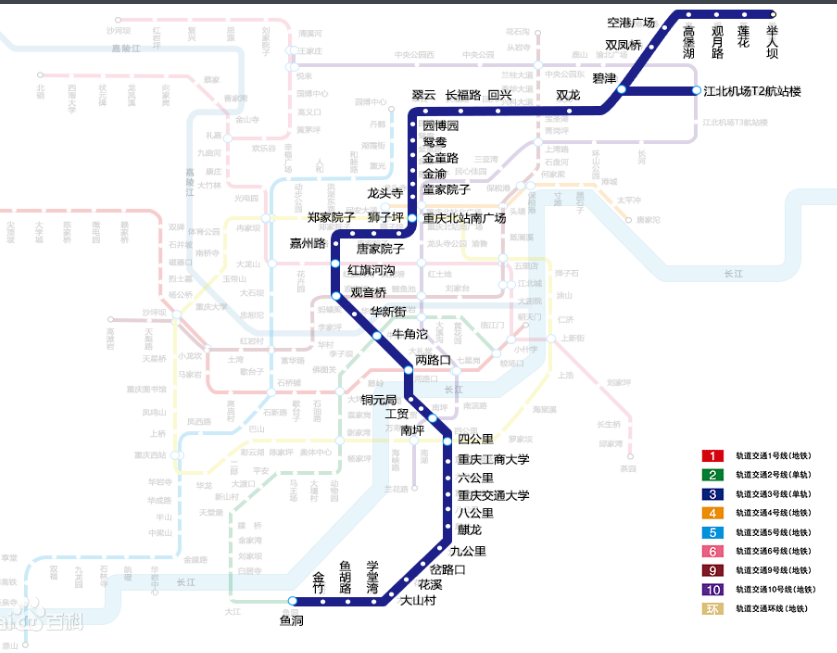 重慶軌道交通3號線(Chongqing Rail Transit Line 3)是中國重慶市第三條建成運(yùn)營的城市軌道交通線路;江北機(jī)場至二塘段于2011年12月30日開通試運(yùn)營;二塘至魚洞段于2012年12月28日開通試運(yùn)營;碧津至舉人壩段于2016年12月28日開通試運(yùn)營。